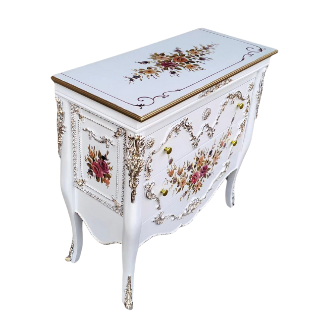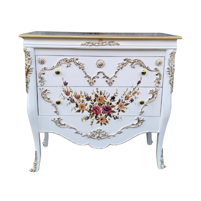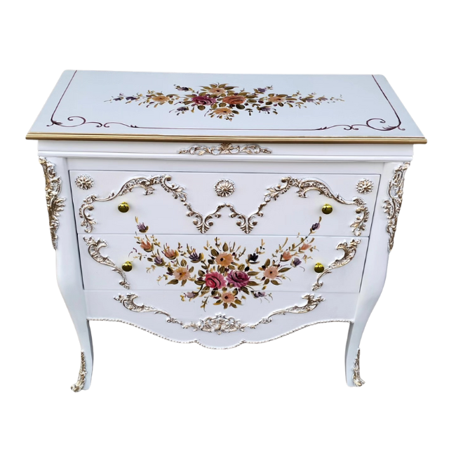 The chest features a stunning hand-painted design, meticulously created using oil paints and finished with deco paint for a vibrant and lasting finish. The artwork is sealed with a protective lacquer, ensuring the colors remain vibrant and the surface smooth for years to come.