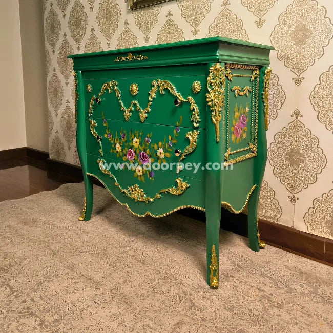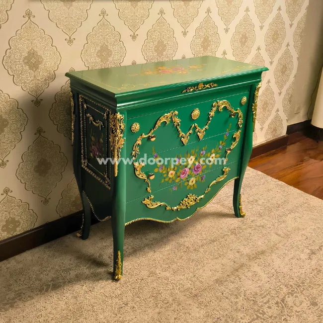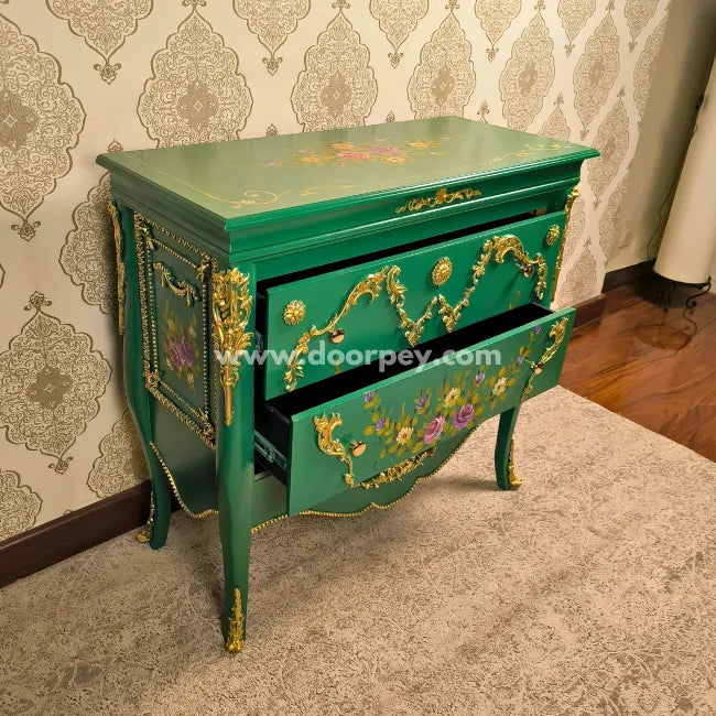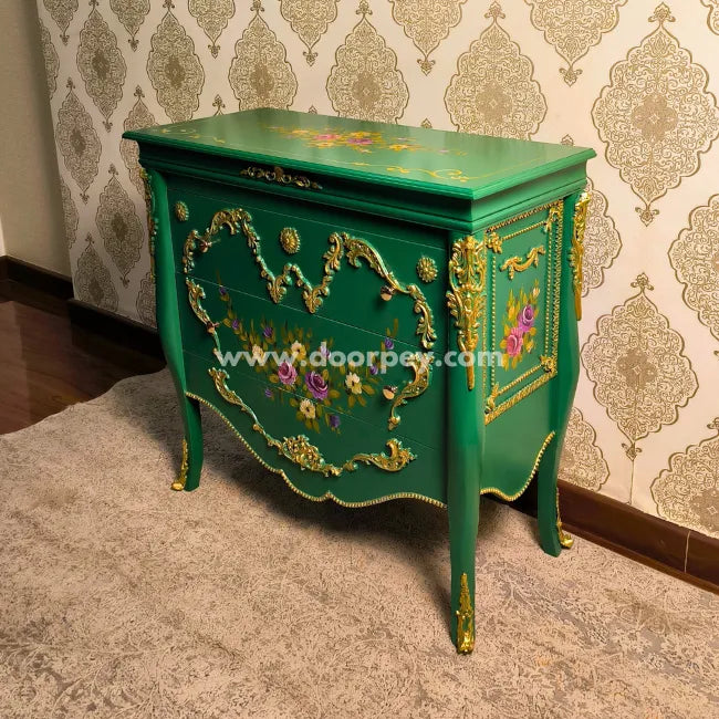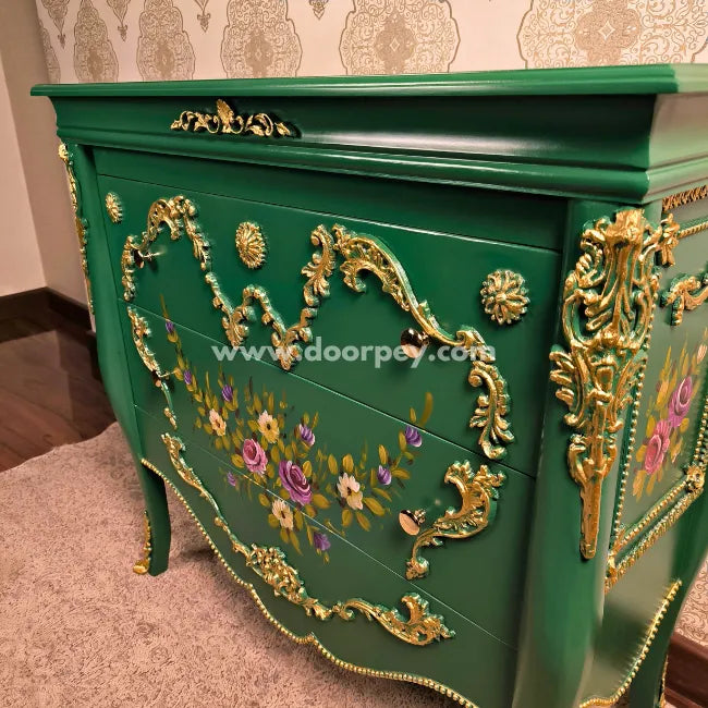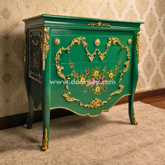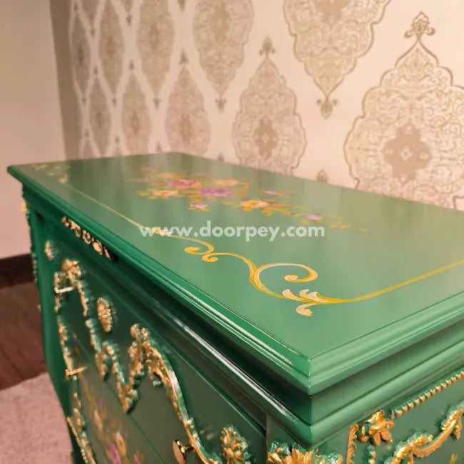 The chest features a stunning hand-painted design, meticulously created using oil paints and finished with deco paint for a vibrant and lasting finish. The artwork is sealed with a protective lacquer, ensuring the colors remain vibrant and the surface smooth for years to come.