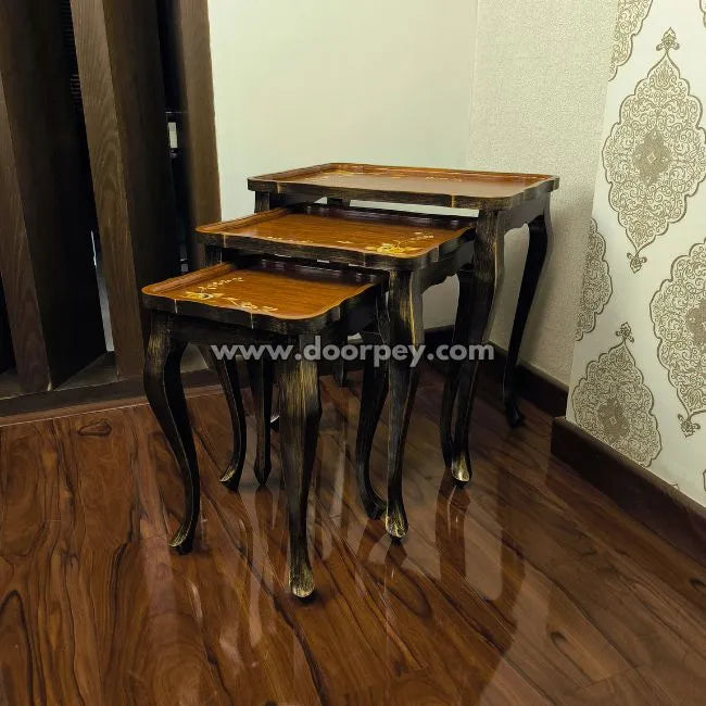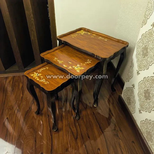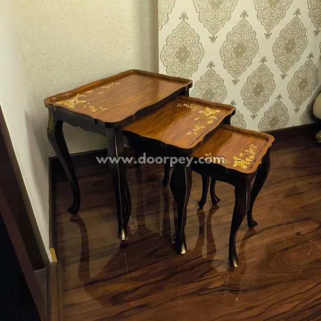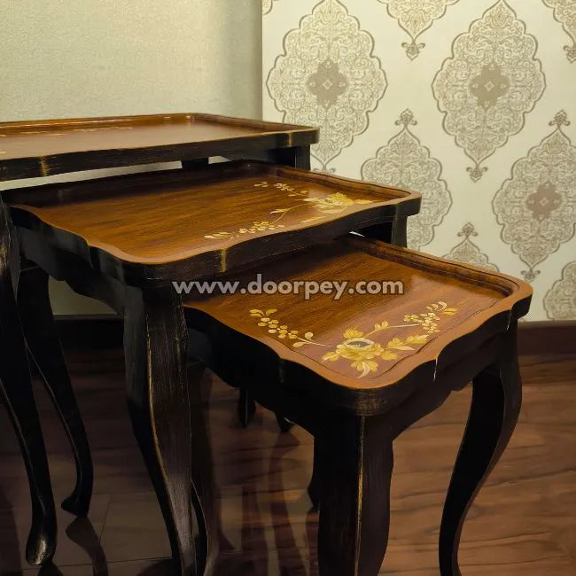 Elevate your interior with the timeless charm of the Dusky Grace Wooden Nesting Table – a handcrafted trio that blends sophistication with functionality. Made from premium Kikar Wood and MDF board, this set features a deep, rich finish paired with elegant hand-painted floral accents, exuding classic warmth and artisanal beauty.