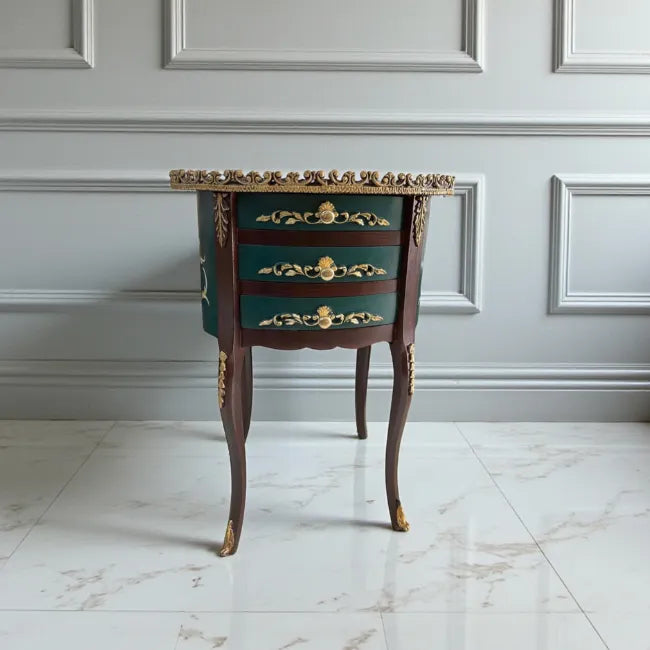 The Emerald Crest Wooden Table is a striking blend of rich craftsmanship and royal elegance. Featuring deep emerald-toned accents, refined gold detailing, and a classic silhouette, this wooden table brings a sense of luxury and distinction to any interior.