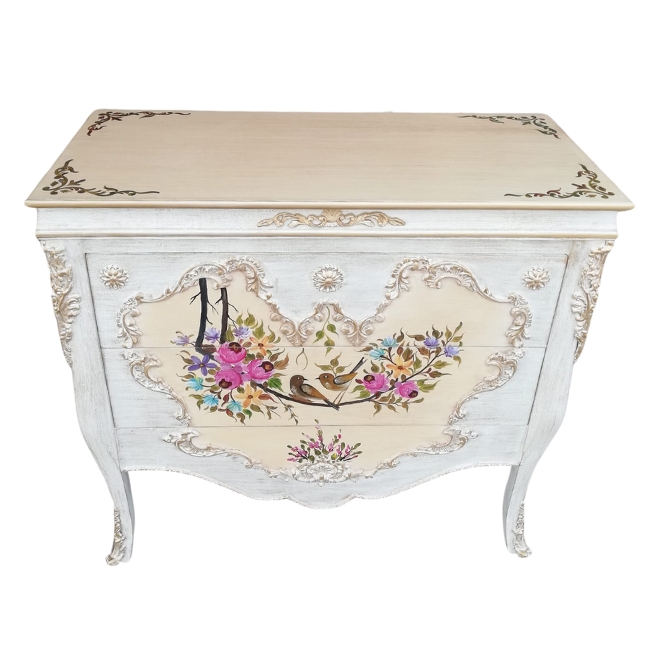 The chest features a stunning hand-painted design, meticulously created using oil paints and finished with deco paint for a vibrant and lasting finish. The artwork is sealed with a protective lacquer, ensuring the colors remain vibrant and the surface smooth for years to come.