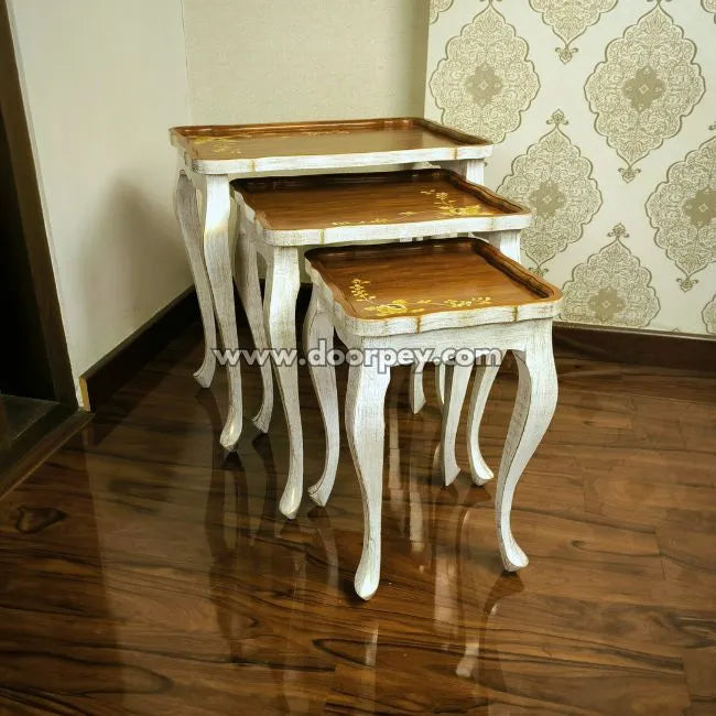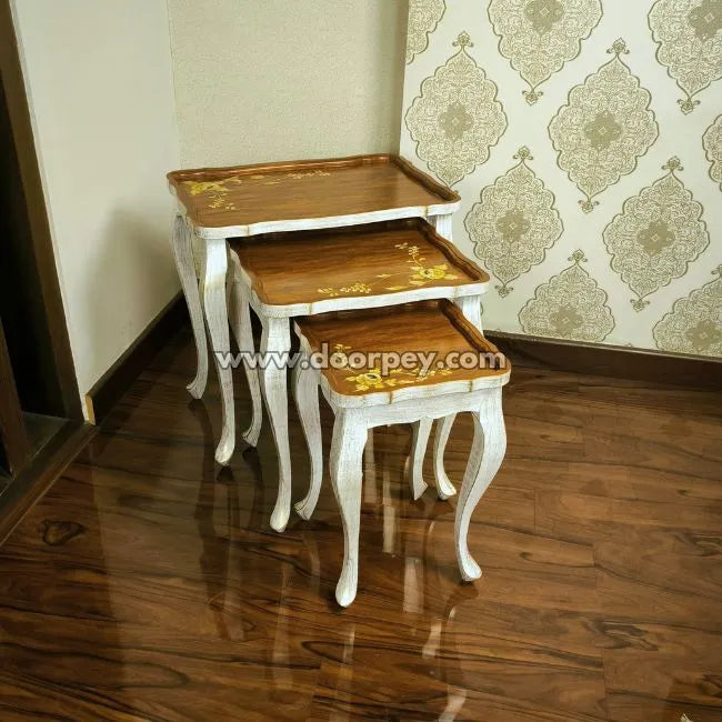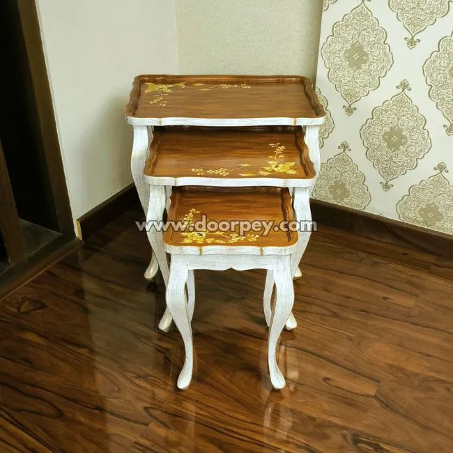 Add timeless elegance to your space with the Florentine Trio Wooden Nesting Table – a hand-painted masterpiece crafted for both beauty and function. Made from durable Kikar Wood and MDF Board, this set of three nesting tables showcases exquisite floral detailing and a rich, dual-tone finish that enhances any traditional or vintage-inspired interior.