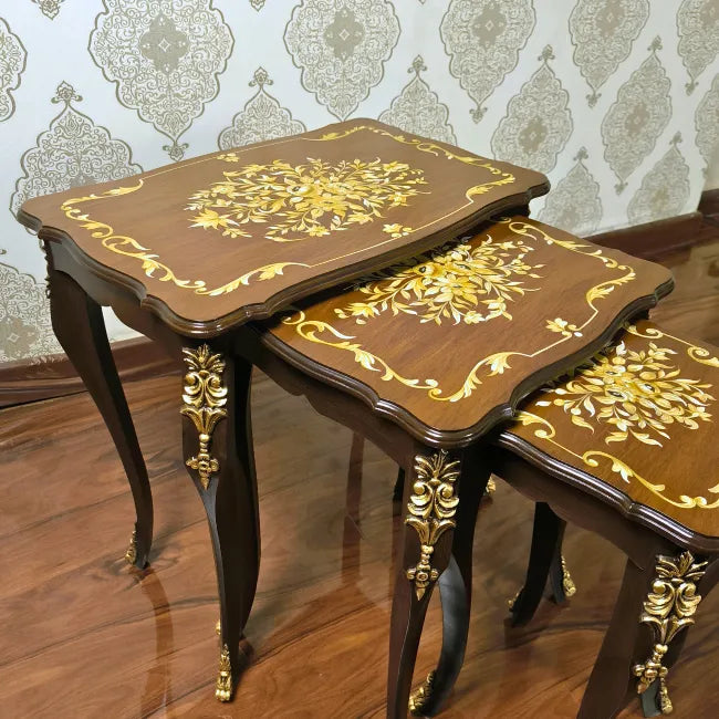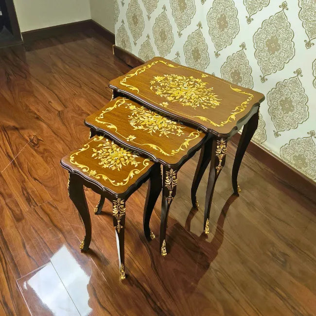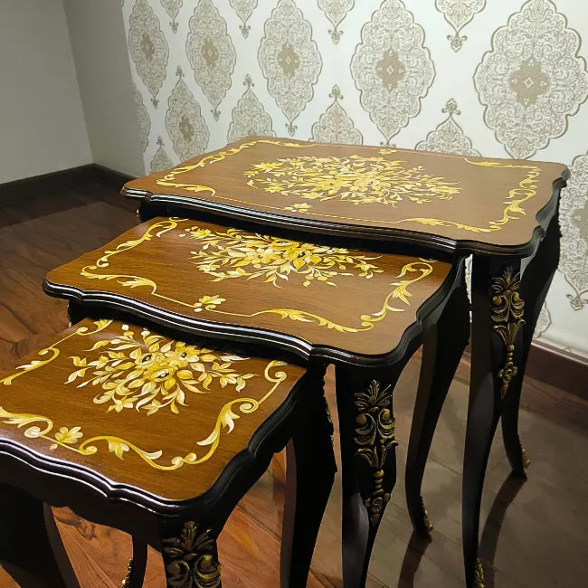Graceful and refined, the Francais Wooden Nesting Table set brings artistic charm and handcrafted elegance to your home. Made from premium Kikar Wood and MDF, this set of three nesting tables showcases stunning hand-painted artwork created with high-quality oil paints, offering a rich blend of craftsmanship and visual appeal.