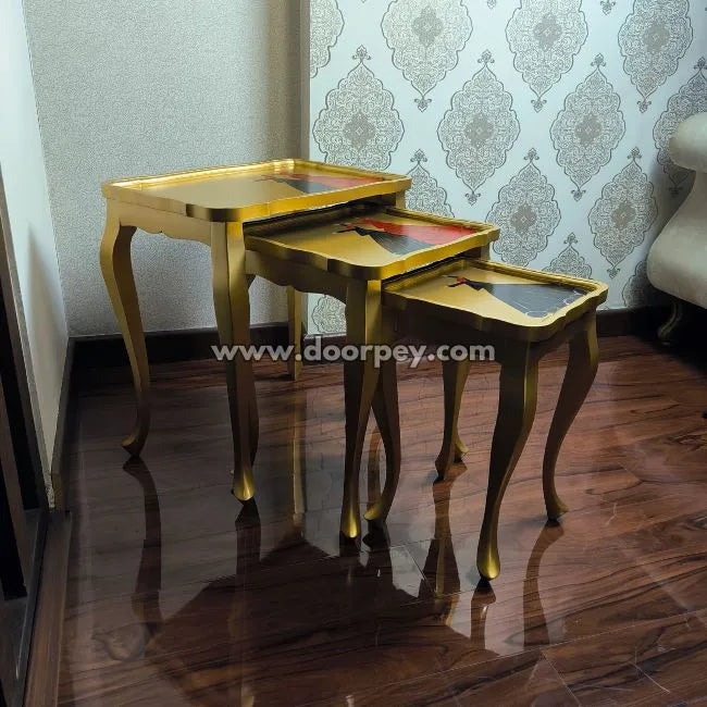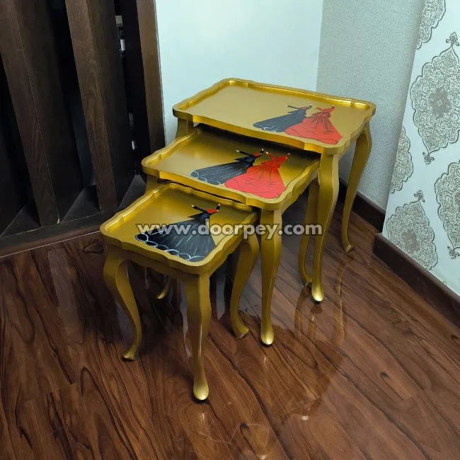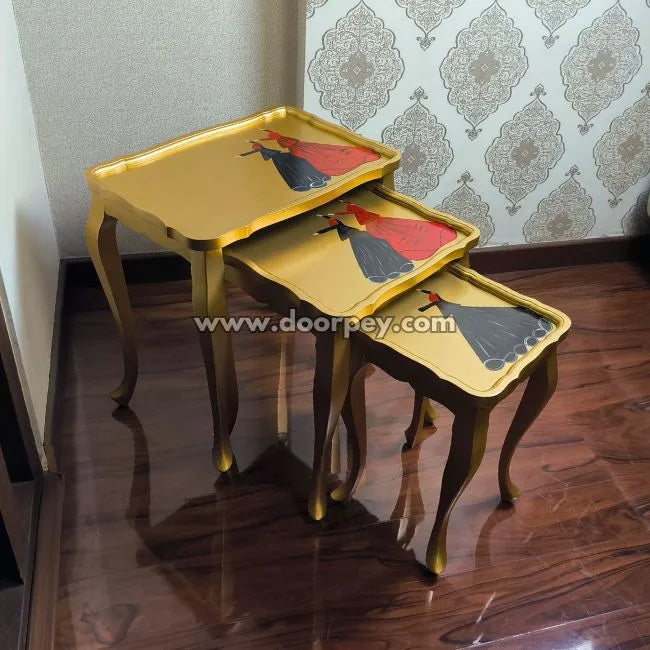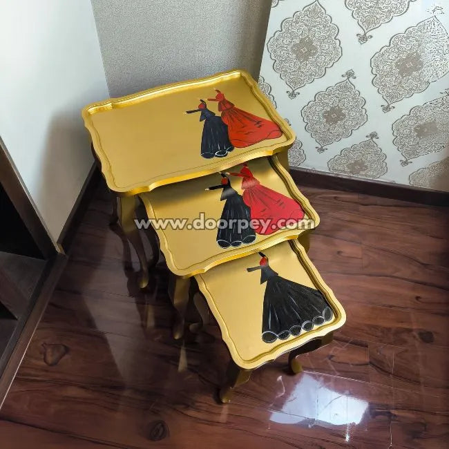 Bring home the spiritual elegance of Sufi art with the Golden Sufi Wooden Nesting Table – a hand-painted trio inspired by the graceful whirl of dervishes. Crafted from high-quality Kikar Wood and MDF, this nesting table set is a perfect fusion of tradition, artistry, and function.