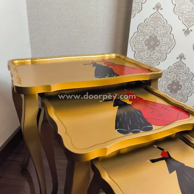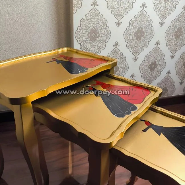 Each tabletop is adorned with hand-painted whirling dervishes, meticulously rendered using premium oil paints to ensure lasting vibrancy and depth. The radiant gold finish enhances the spiritual symbolism while adding a luxurious touch to your space. Every table is sealed and protected with a high-grade lacquer coating for long-term durability and shine.