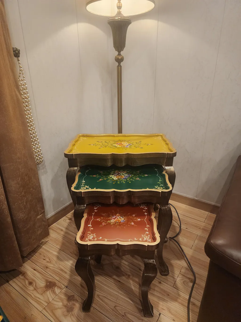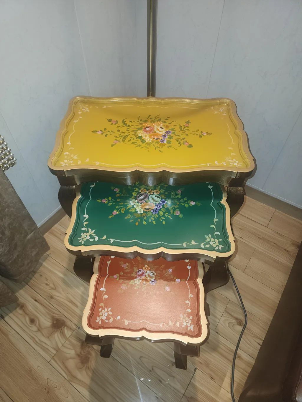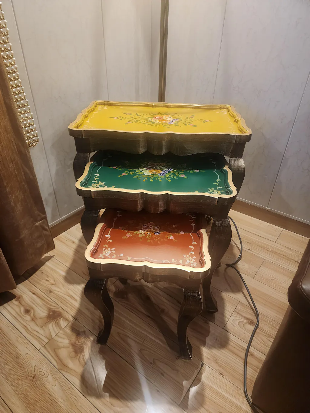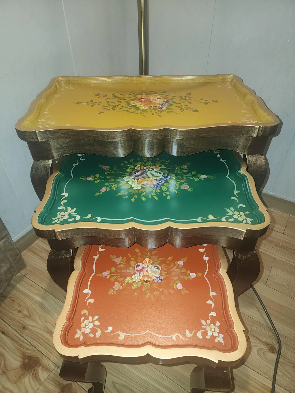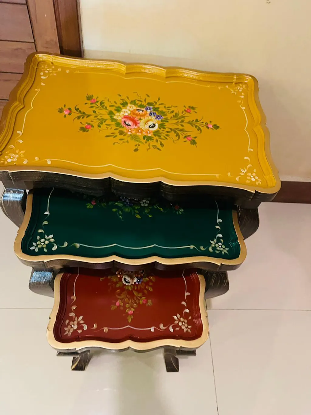 Add a vibrant and artistic touch to your space with the Harmony Hues Wooden Nesting Table Set. Crafted from premium Kikar wood and MDF board, this beautifully designed set features intricate hand-painted floral patterns on a rich wooden base. The multicolor design—featuring warm tones of gold, green, and red—adds a lively and elegant aesthetic to any home.