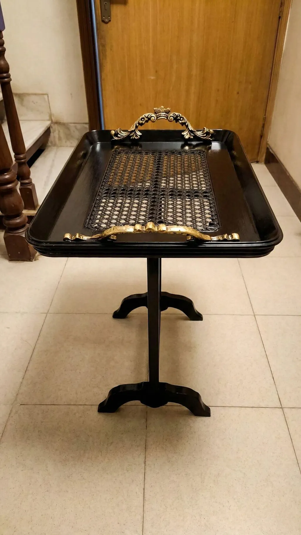 The tabletop features a stunning hand-woven cane center, adding texture, sophistication, and artisanal charm. Finished with a durable lacquer coating, this folding tray table is built to last while maintaining its elegant deep-black sheen.