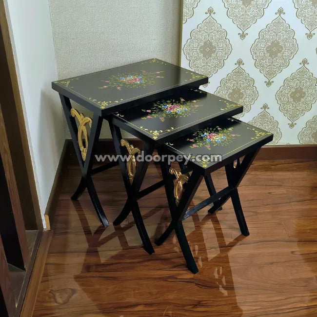 Elegant, artistic, and timeless — the Midnight Bloom Wooden Nesting Table set brings refined beauty and handcrafted detail to your living space. Made from durable Kikar Wood and MDF, this set of three nesting tables features exquisite hand-painted floral artwork, meticulously created using rich oil paints.