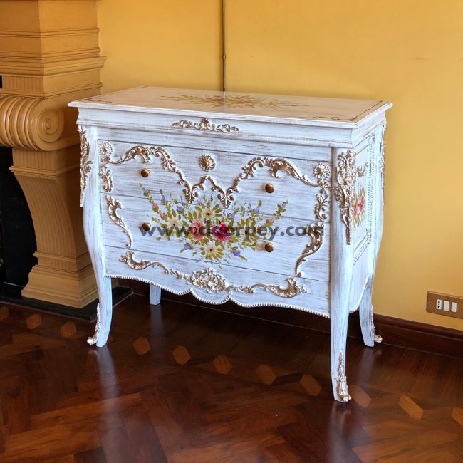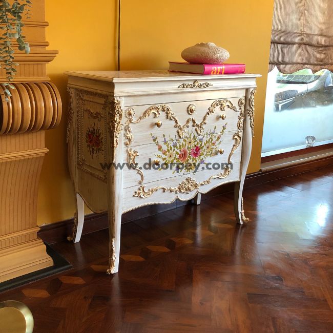 The chest features a stunning hand-painted design, meticulously created using oil paints and finished with deco paint for a vibrant and lasting finish. The artwork is sealed with a protective lacquer, ensuring the colors remain vibrant and the surface smooth for years to come.