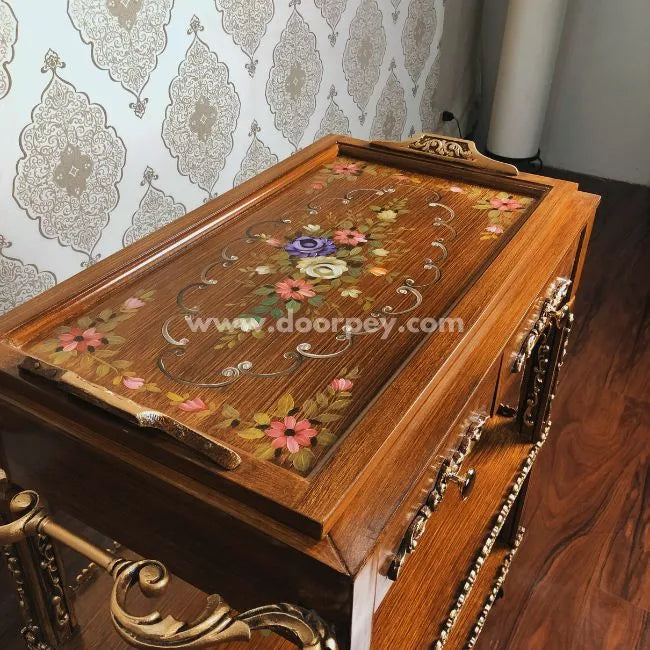 The Petal Triple Harmony is a striking combination of beauty and utility, designed to make a statement in your home while offering unmatched functionality. Featuring exquisite hand-painted floral designs, this 3-tier wooden cart is a practical and decorative masterpiece.