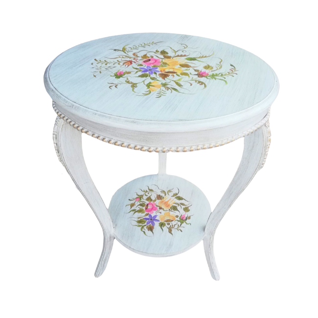 Elevate your living space with this stunning French end table, meticulously hand-painted with intricate designs. Crafted to embody both elegance and durability, this piece seamlessly blends classic French charm with a touch of nature.