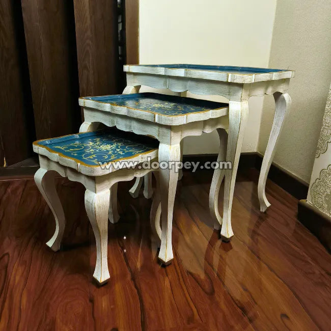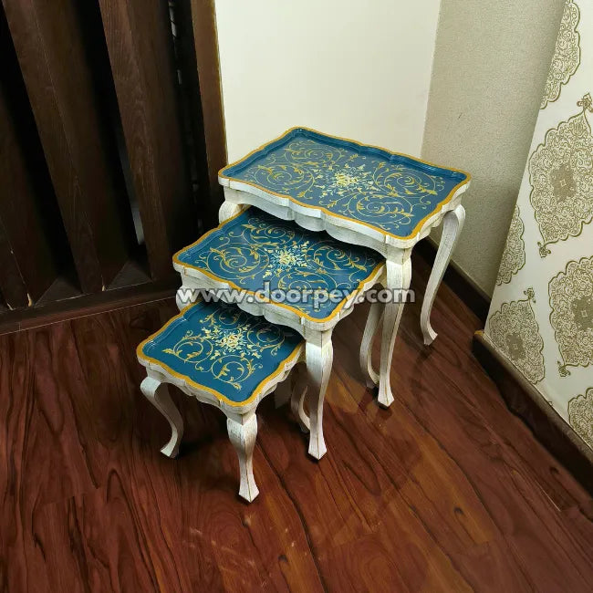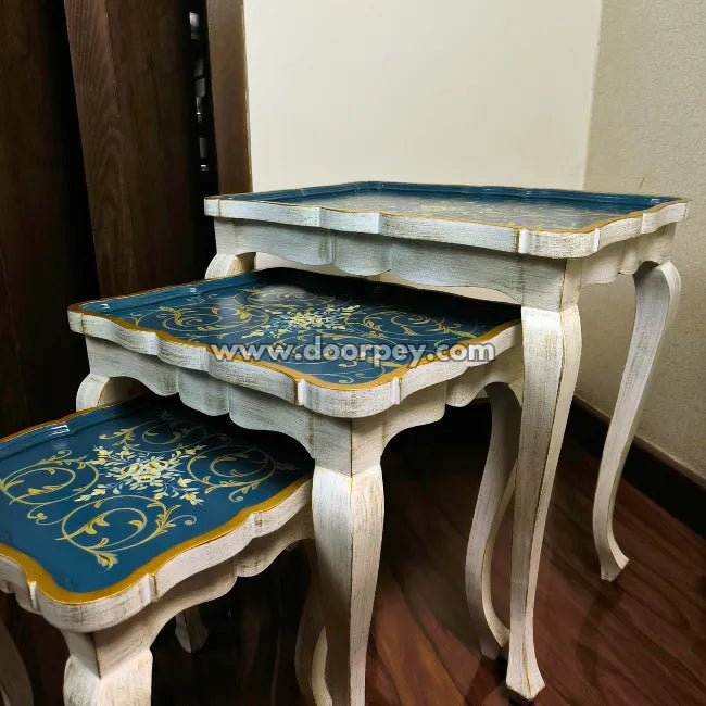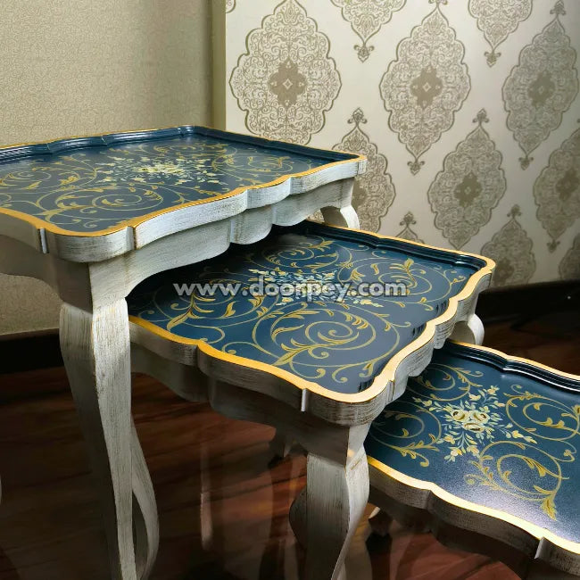 Elevate your living space with the Royal Azure Wooden Nesting Table. Featuring hand-painted golden motifs on a deep azure surface, this elegant trio combines timeless artistry with practical design. Perfect for serving, styling, or saving space, these versatile tables nest neatly together while adding a regal touch to any room.