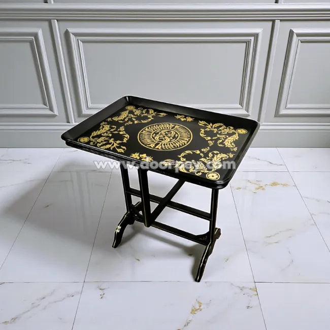 Elevate your hosting experience with the Royal Emblem Folding Tray Table, a perfect blend of timeless elegance and everyday functionality. Crafted from durable wood and finished with a striking hand-painted black and gold emblem design, this tray table adds a touch of royalty to any space.