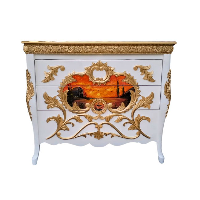 The chest features a stunning hand-painted design, meticulously created using oil paints and finished with deco paint for a vibrant and lasting finish. The artwork is sealed with a protective lacquer, ensuring the colors remain vibrant and the surface smooth for years to come.