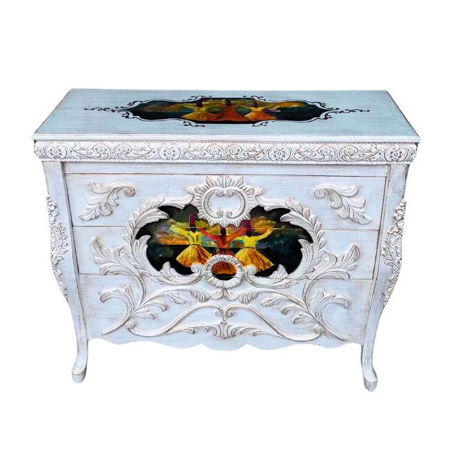 The chest features a stunning hand-painted design, meticulously created using oil paints and finished with deco paint for a vibrant and lasting finish. The artwork is sealed with a protective lacquer, ensuring the colors remain vibrant and the surface smooth for years to come.